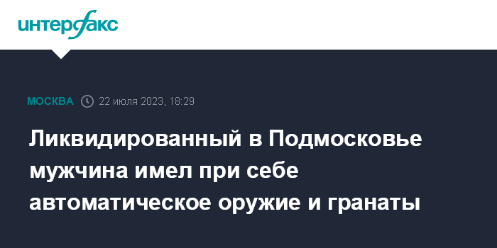 Москва. 22 июля. INTERFAX.RU - Открывший в субботу стрельбу в коттеджном поселке в Подмосковье мужчина имел в арсенале автоматическое оружие и гранаты, сообщили "Интерфаксу" в пресс-службе ГУ Росгвардии по Московской области.