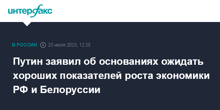 Москва. 23 июля. INTERFAX.RU - Состояние российской и белорусской экономик позволяют ожидать, что в 2023 году обе страны продемонстрируют хороший рост, заявил президент РФ Владимир Путин.