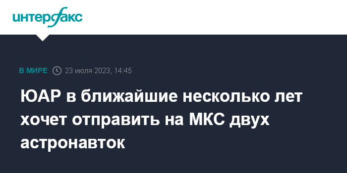Москва. 23 июля. INTERFAX.RU - Южно-Африканская Республика хочет организовать миссии двух астронавток на Международную космическую станцию (МКС), сообщил исполнительный директор Южноафриканского национального космического агентства (САНСА) Хумбулани Мудау.