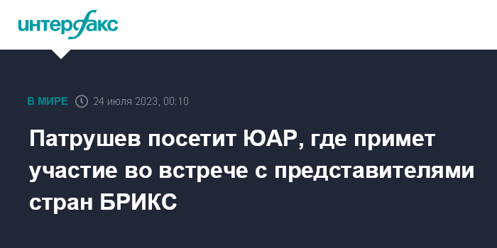 Москва. 24 июля. INTERFAX.RU - Николай Патрушев посетит 24-25 июля Южно-Африканскую Республику (ЮАР), там секретарь Совета безопасности РФ примет участие во встрече высоких представителей стран БРИКС, сообщили в пресс-службе аппарата Совбеза.