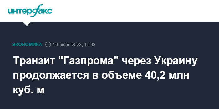 Представитель "Газпрома" Сергей Куприянов сообщил, что российский газ подается для транзита через Украину через территорию Украины в объеме, подтвержденном украинской стороной через ГИС "Суджа", - 40,2 млн куб. м на 24 июля. Заявка на ГИС "Сохрановка" отклонена.