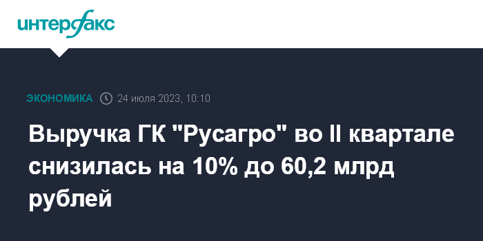 Москва. 24 июля. INTERFAX.RU - Выручка ГК "Русагро" во втором квартале этого года составила 60,2 млрд рублей (до межсегментных элиминаций), что на 10% меньше, чем за аналогичный период прошлого года, сообщается в пресс-релизе компании.