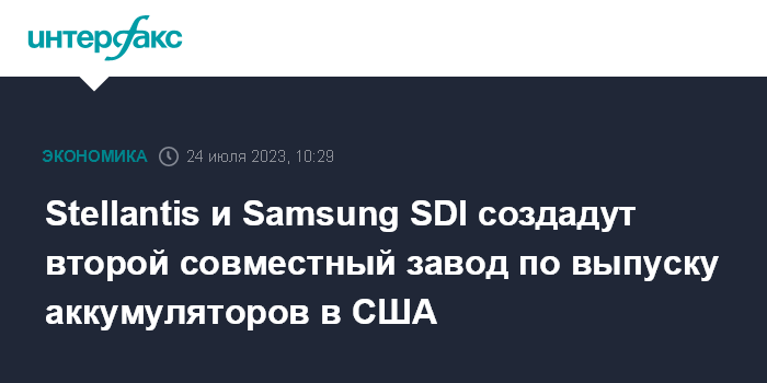 Москва. 24 июля. INTERFAX.RU - Европейский автомобильный концерн Stellantis NV и южнокорейская Samsung SDI договорились о строительстве второго совместного предприятия по производству аккумуляторов в США, сообщил Stellantis.