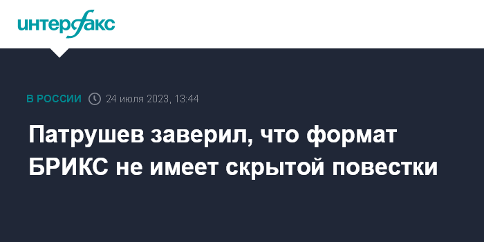 Москва. 24 июля. INTERFAX.RU - Секретарь Совбеза России Николай Патрушев заявил, что формат БРИКС не имеет конфронтационной или скрытой повестки, что делает его привлекательным для многих государств глобального Юга и Востока.