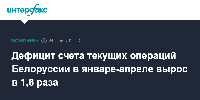 Москва. 24 июля. INTERFAX.RU - Отрицательное сальдо счета текущих операций платежного баланса Белоруссии по итогам января-апреля 2023 года составило $1,8 млрд (7,8% ВВП), что в 1,6 раза больше, чем в январе-апреле 2022 года, говорится в материалах Нацбанка страны.