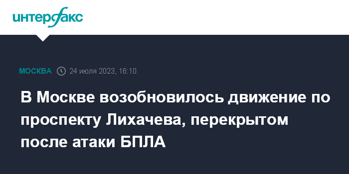 Москва. 24 июля. INTERFAX.RU - В Москве полностью восстановили движение по проспекту Лихачева, который с раннего утра был перекрыт после падения беспилотника на строящийся бизнес-центр.