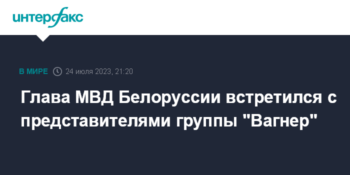 Москва. 24 июля. INTERFAX.RU - Глава МВД Белоруссии Иван Кубраков встретился с представителями группы "Вагнер", сообщили в пресс-службе МВД Белоруссии в понедельник.