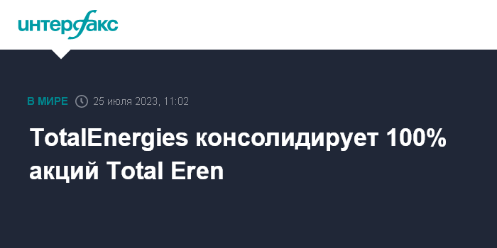 Москва. 25 июля. INTERFAX.RU - Французская энергетическая компания TotalEnergies SA выкупит все еще не принадлежащие ей акции фирмы Total Eren у других акционеров, говорится в пресс-релизе компании.
