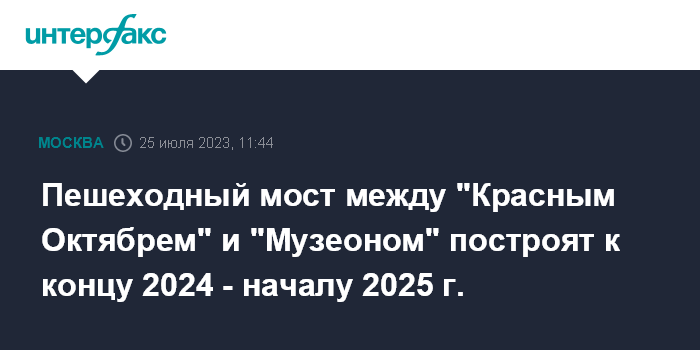 Москва. 25 июля. INTERFAX.RU - Новый мост, который свяжет парк "Музеон" и территорию около "Красного Октября", может быть достроен в конце 2024 или начале 2025 года, сообщил мэр Москвы Сергей Собянин.