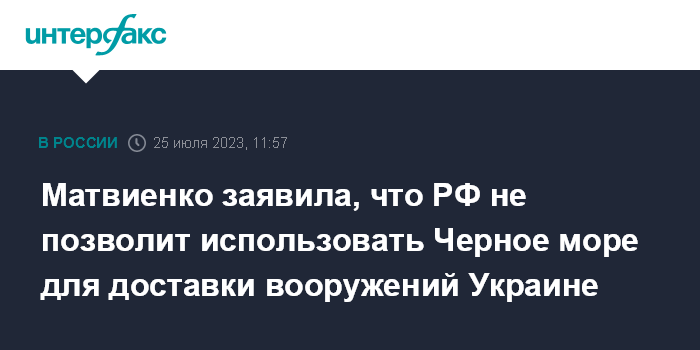Москва. 25 июля. INTERFAX.RU - Россия не позволит использовать "зерновой коридор" для доставки вооружений на Украину и для организации диверсионных и террористических акций, заявила спикер Совета Федерации Валентина Матвиенко.