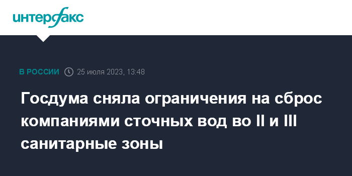 Москва. 25 июля. INTERFAX.RU - Госдума приняла в третьем чтении поправки в Водный кодекс, которые снимают ограничения на сброс компаниями сточных вод во вторые и третьи зоны санитарной охраны источников питьевого и хозяйственно-бытового водоснабжения.