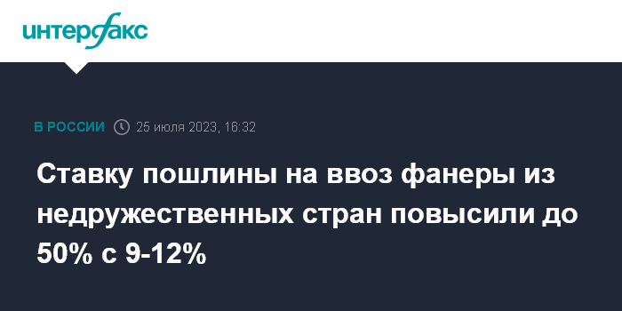 Ставку пошлины на ввоз фанеры из недружественных стран повысили до 50% с 9-12%