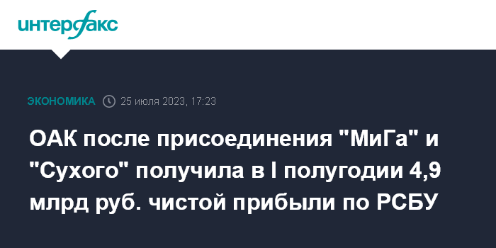 Москва. 25 июля. INTERFAX.RU - ПАО "Объединенная авиастроительная корпорация" (ОАК) в I полугодии 2023 года получило 4,9 млрд руб. чистой прибыли по РСБУ против 6,3 млрд руб. чистого убытка за этот же период прошлого года, сказано в отчетности компании.