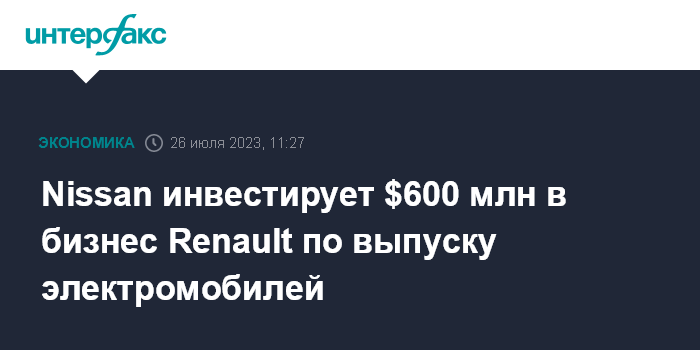 Москва. 26 июля. INTERFAX.RU - Renault Group и Nissan Motor Co. утвердили договоренности по ключевым пунктам, согласованным в феврале 2023 года, в том числе о сотрудничестве в производстве электромобилей и ребалансировке перекрестного владения акциями.