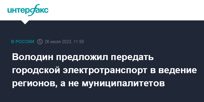 Москва. 26 июля. INTERFAX.RU - Вопросы развития городского электротранспорта должны быть переданы в ведение региональной, а не муниципальной власти, считает председатель Госдумы Вячеслав Володин.