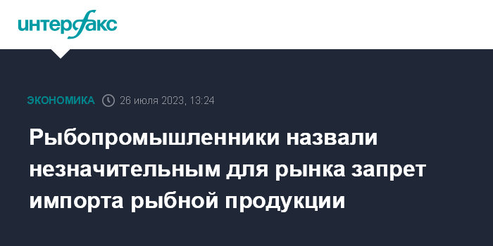 Москва. 26 июля. INTERFAX.RU - Запрет на ввоз готовой продукции из рыбы и морепродуктов из недружественных стран, который планирует ввести Россия, касается незначительной доли рынка, подсчитали во Всероссийской ассоциации рыбопромышленников (ВАРПЭ).