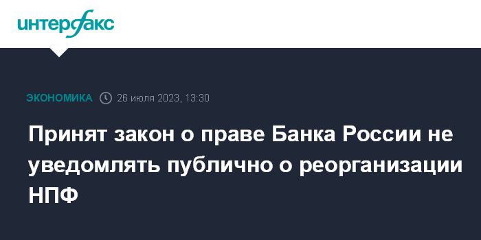 Принят закон о праве Банка России не уведомлять публично о реорганизации НПФ