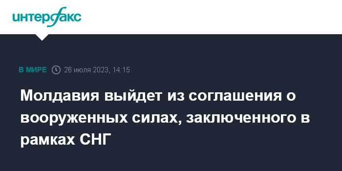 Москва. 26 июля. INTERFAX.RU - Молдавия выходит из соглашения о вооруженных силах и пограничных войсках, заключенного в рамках СНГ.