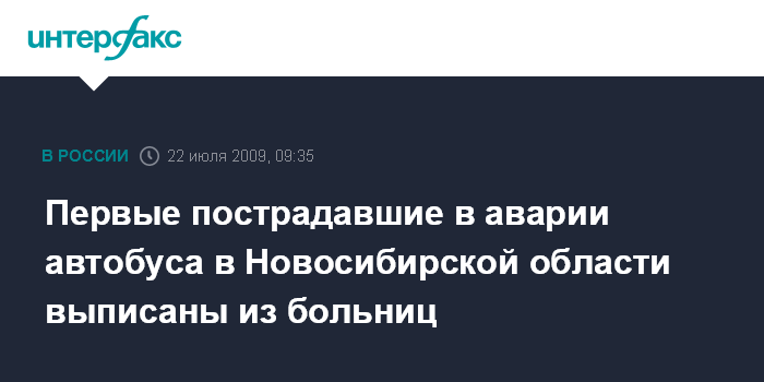 Москва. 22 июля. INTERFAX.RU - Четверо пострадавших в аварии автобуса, которая произошла в минувший понедельник в Новосибирской области, выписаны из больниц Новосибирска, сообщила в среду пресс-служба администрации Томска. Как отметили в пресс-службе, в четверг они будут отправлены домой из Новосибирска. Необходимый транспорт предоставлен администрацией Томска. В сообщении также говорится, что на сегодняшний день двое пострадавших в аварии остаются в состоянии крайней степени тяжести, трое - в тяжелом состоянии.