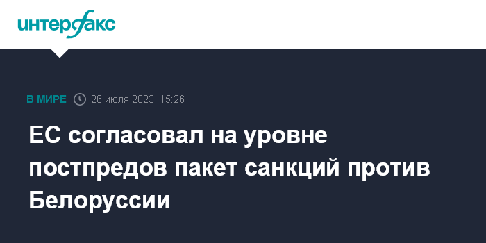 Москва. 26 июля. INTERFAX.RU - Постпреды стран Евросоюза согласовали введение нового пакета санкций в отношении Белоруссии, сообщается в среду в твиттер-аккаунте председательства Испании в Совете ЕС.