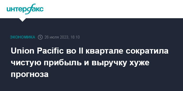 Москва. 26 июля. INTERFAX.RU - Американский железнодорожный оператор Union Pacific Corp. во втором квартале 2023 года сократил чистую прибыль на 14% в годовом выражении, этот показатель, как и выручка, не оправдал ожиданий аналитиков.