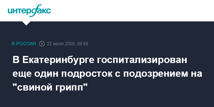 Москва. 22 июля. INTERFAX.RU - В городскую клиническую больницу N40 в Екатеринбурге в среду с подозрением на заболевание гриппом A/H1N1 был доставлен еще один, четвертый по счету подросток, прибывший из Великобритании. Как сообщила агентству "Интерфакс-Урал" пресс-секретарь ГКБ N40 Марина Рувинская, всего в настоящее время в больнице находятся четверо подростков с подозрением на вирус гриппа A/H1N1.