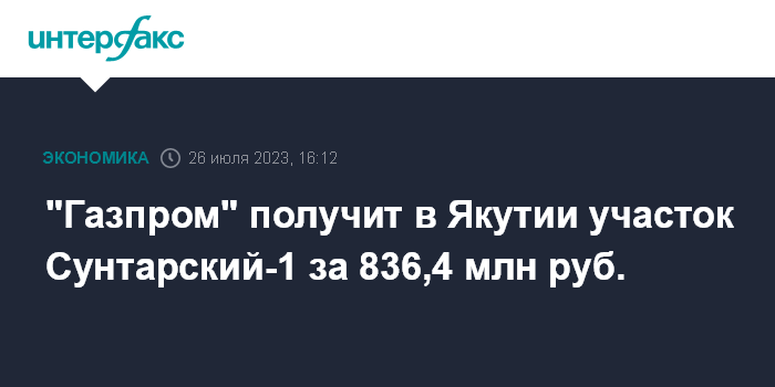 Москва. 26 июля. INTERFAX.RU - ПАО "Газпром" признано победителем на аукционе за Сунтарский-1 участок в Якутии, сообщили "Интерфаксу" в Минприроды.