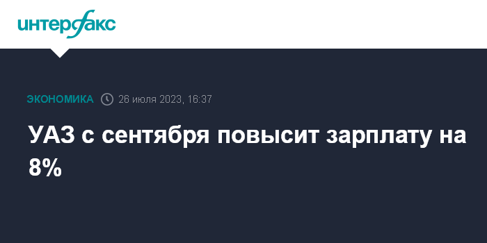 Москва. 26 июля. INTERFAX.RU - "Ульяновский автозавод" (УАЗ, входит в группу "Соллерс") с 1 сентября на 8% повысит заработную плату сотрудникам, сообщает пресс-служба УАЗа.