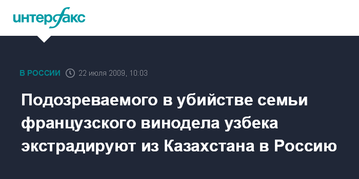 Москва. 22 июля. INTERFAX.RU - Гражданин Узбекистана, 24-летний Хуршид Нормурадов, подозреваемый в убийстве в Москве семьи французского бизнесмена-винодела, передается властями Казахстана России. Как сообщает в среду официальный сайт СКП РФ, сегодня в сопровождении конвоя сотрудников российского бюро Интерпола и ФСИН России он будет экстрадирован в РФ.