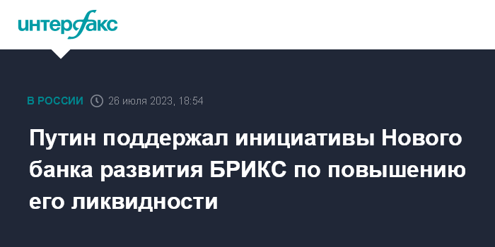 Москва. 26 июля. INTERFAX.RU - Россия поддерживает идеи персонала Нового банка развития БРИКС, связанные с повышением его ликвидности, РФ является добросовестным участником этой структуры, заявил российский президент Владимир Путин.