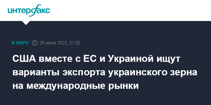 Москва. 26 июля. INTERFAX.RU - Власти США работают с ЕС и с Украиной над возможностью возобновления экспорта сельхозпродукции из украинских портов после того, как Россия вышла из Черноморской зерновой инициативы.