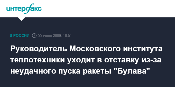 Руководитель Московского института теплотехники уходит в отставку из-за неудачного пуска ракеты "Булава"