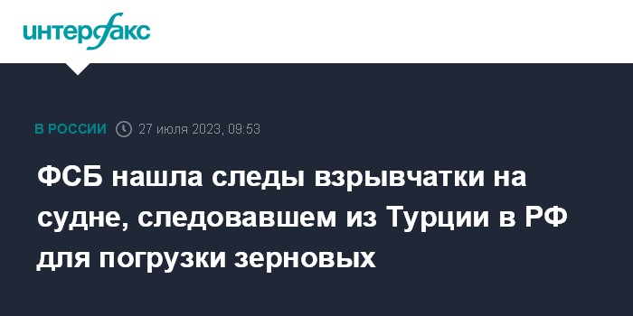 ФСБ в минувший понедельник уже сообщала, что в трюме иностранного сухогруза, следовавшего из Турции в порт Ростова-на-Дону для погрузки зерновых культур, "обнаружены следы взрывчатых веществ динитротолуола и тетрила, также признаки стороннего вмешательства в конструктивные части сухогруза".