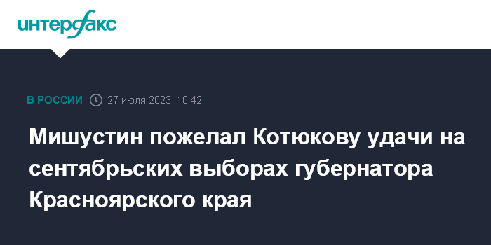 Москва. 27 июля. INTERFAX.RU - Премьер РФ Михаил Мишустин пожелал врио губернатора Красноярского края Михаилу Котюкову удачи на предстоящих выборах главы региона.