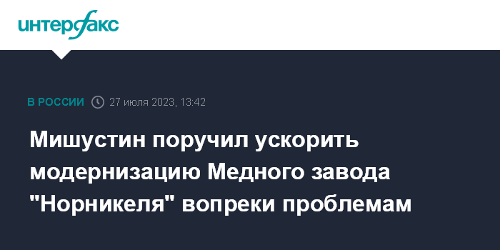 Москва. 27 июля. INTERFAX.RU - Премьер-министр Михаил Мишустин, посетивший производственные объекты "Норильского никеля" в Норильске, поручил ускорить модернизацию Медного завода, которая столкнулась с ограничениями из-за отказа западных производителей оборудования от сотрудничества.