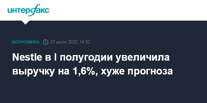Москва. 27 июля. INTERFAX.RU - Швейцарская Nestle, крупнейший производитель продуктов питания и безалкогольных напитков в мире, в первом полугодии нарастила выручку на 1,6%, хуже ожиданий аналитиков.