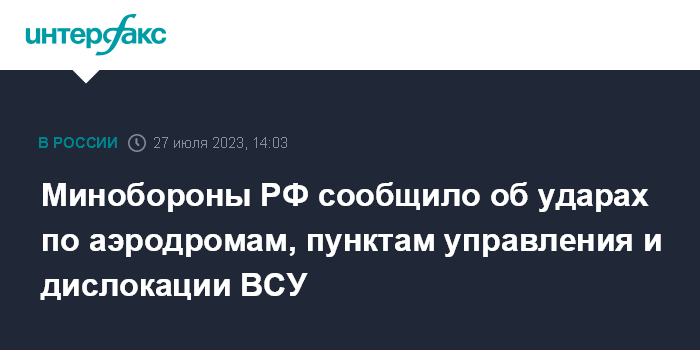 Москва. 27 июля. INTERFAX.RU - Российские военные нанесли сосредоточенные удары по аэродромам, пунктам управления ВСУ, цехам и местам хранения беспилотных катеров, а также поступившего из Европы и США вооружения, заявил официальный представитель Минобороны РФ Игорь Конашенков на брифинге в четверг.
