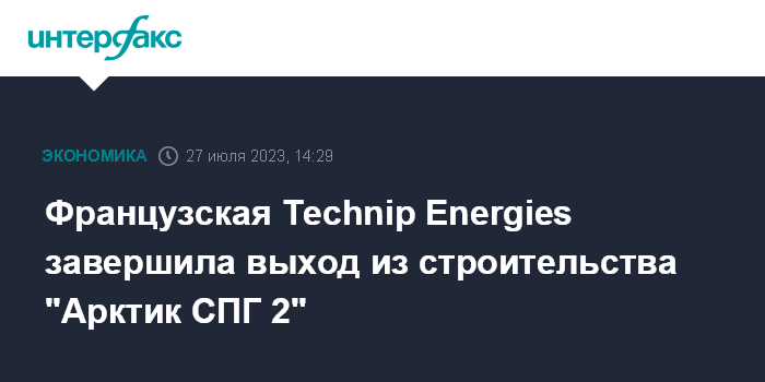 Москва. 27 июля. INTERFAX.RU - Французский подрядчик Technip Energies во втором квартале 2023 года завершил выход из проекта "Арктик СПГ 2", как и планировал это сделать в более ранних заявлениях (в первой половине 2023 года).