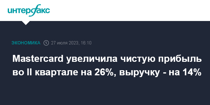 Москва. 27 июля. INTERFAX.RU - Американская Mastercard Inc., оператор одной из крупнейших в мире платежных систем, увеличила выручку во втором квартале 2023 года на 14%, чистую прибыль - на 26%.