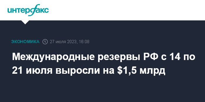 Международные резервы РФ с 14 по 21 июля выросли на $1,5 млрд