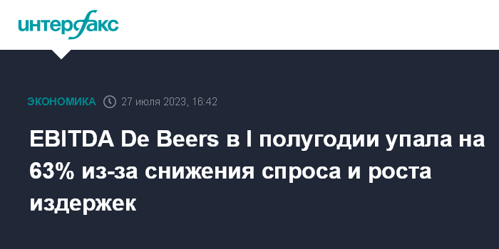 Москва. 27 июля. INTERFAX.RU - EBITDA алмазодобывающей De Beers в первом полугодии 2023 года упала на 63% - до $347 млн, сообщила компания Anglo American, которая контролирует De Beers.
