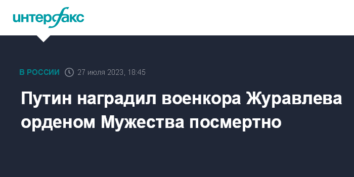 Москва. 27 июля. INTERFAX.RU - Президент Владимир Путин своим указом наградил посмертно орденом Мужества военкора МИА "Россия сегодня" Ростислава Журавлева. Документ опубликован на сайте Кремля.