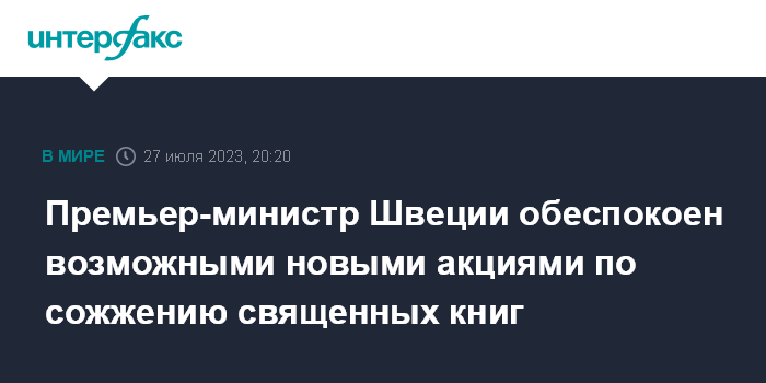 Москва. 27 июля. INTERFAX.RU - Премьер-министр Швеции Ульф Кристерссон выразил обеспокоенность в связи с тем, что полиция может разрешить очередные акции по сожжению священных книг, передает АР.