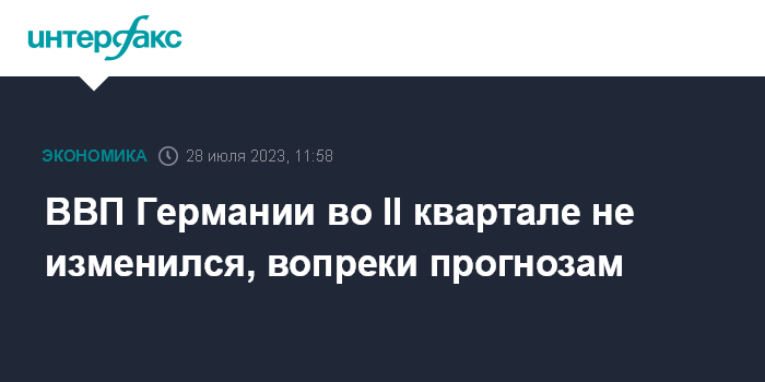 Москва. 28 июля. INTERFAX.RU - ВВП Германии во втором квартале 2023 года не изменился по сравнению с предыдущими тремя месяцами. Таковы предварительные данные Федерального статистического агентства ФРГ (Destatis). Эксперты, опрошенные Trading Economics, в среднем прогнозировали рост на 0,1%.