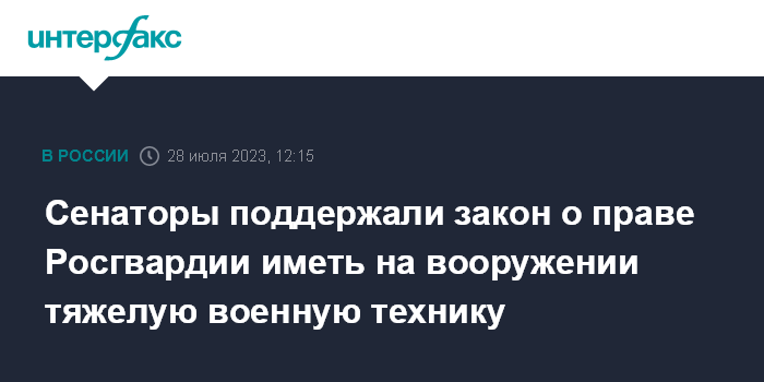 Москва. 28 июля. INTERFAX.RU - Совет Федерации одобрил в пятницу закон, наделяющий Росгвардию правом иметь на вооружении военную, в том числе тяжелую, технику.