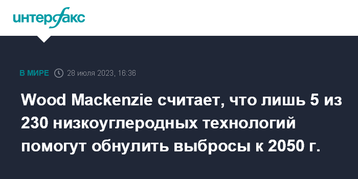 Москва. 28 июля. INTERFAX.RU - Только 5 прорывных из 230 низкоуглеродных технологий помогут достичь нулевых показателей выбросов к 2050 году, считает исследовательская группа компании Wood Mackenzie.