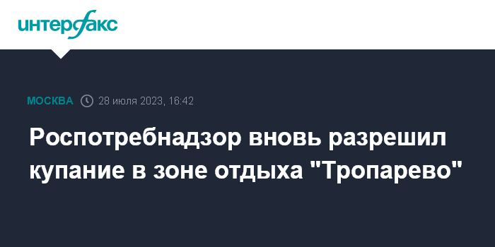 Москва. 28 июля. INTERFAX.RU - Купание в зоне отдыха "Тропарево", которая ранее была закрыта, вновь разрешено, сообщается в пятницу на сайте столичного управления Роспотребнадзора.