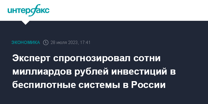 Москва. 28 июля. INTERFAX.RU - Российский рынок беспилотных авиасистем оценивается в один триллион рублей, в ближайшие годы инвестиции в отрасль достигнут сотен миллиардов рублей, считает инвестиционный директор Фонда Национальной технологической инициативы (НТИ) Дионис Гордин.