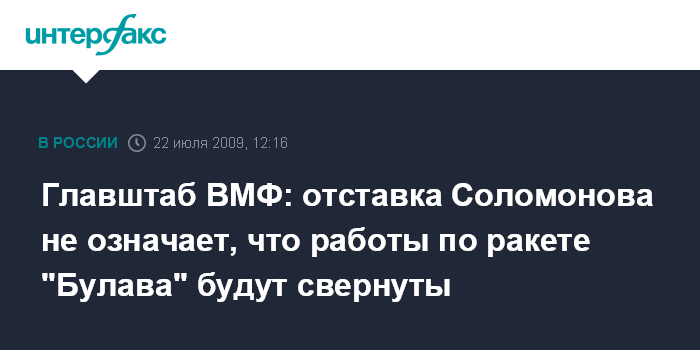 Москва. 22 июля. INTERFAX.RU - Работы по созданию нового морского стратегического ракетного комплекса "Булава" будут продолжены, несмотря на отставку руководителя Московского института теплотехники (МИТ) Юрия Соломонова, заявил "Интерфаксу-АВН" в среду высокопоставленный представитель Главного штаба ВМФ.