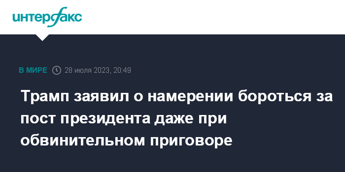 Москва. 28 июля. INTERFAX.RU - Экс-президент США Дональд Трамп в пятницу заявил, что продолжит участвовать в президентской гонке даже в случае, если его признают виновным в рамках уголовных дел.